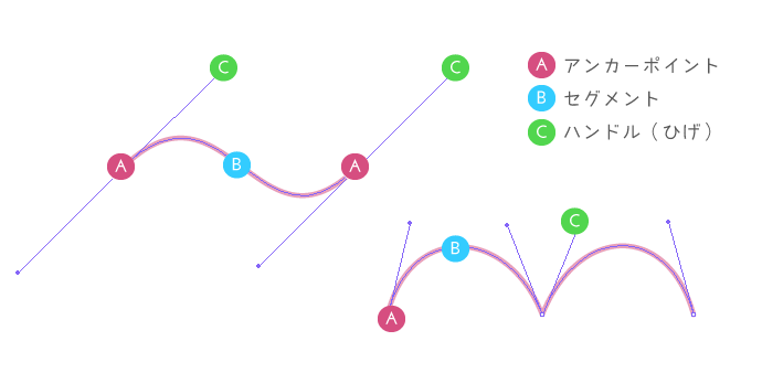 Photoshop や Illustrator のペンツールで描く曲線を、ベジェ曲線、アンカーやハンドルも含めてパスと言ったりします。