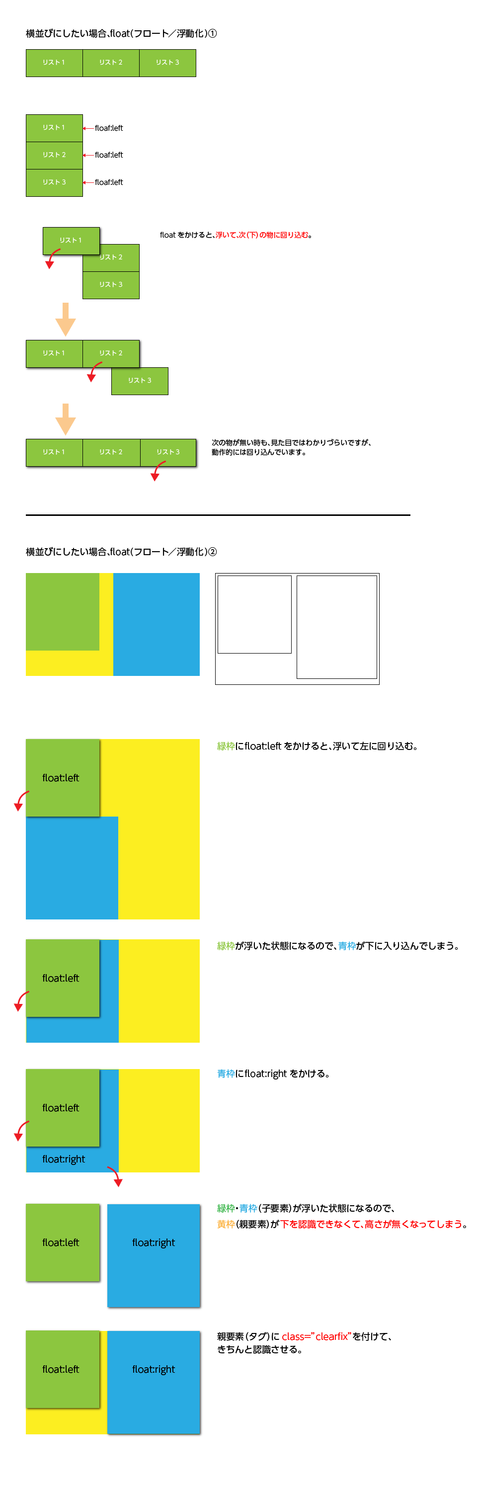 ◎clear floatプロパティで左寄せ、 または右寄せを指定された要素に対する回り込みを解除する際に使用。floatとセットで覚える