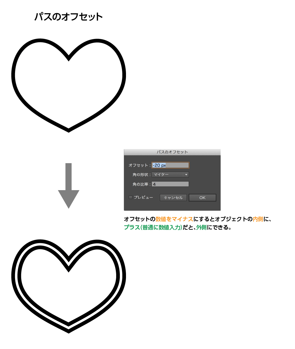 このパスのオフセットというのは、今あるパスの外側、内側に